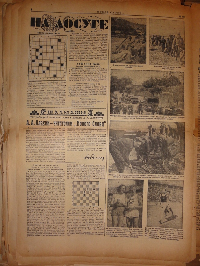 Как явствует из преамбулы «А.А.Алехин – читателям “Нового слова”», чемпион мира планировал через свой отдел в «НС» организовать в недалеком будущем турнир по переписке и намеревался вступить с читателями газеты – с теми, «кто искренне желает усовершенствоваться в этом искусстве» (шахматах) в активную переписку… Невольно задумаешься – а насколько Александр Александрович, планируя все это в начале августа 43-го, владел информацией о положении на Восточном фронте, где к тому времени Красная армия развивала успех в колоссальной Курской битве…