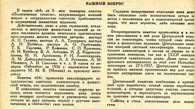 В «Важном вопросе» врио главреда «Шахмат в СССР» совершенно справедливо возмутился – почему вину за сотрудничество многих ведущих советских композиторов (начиная с самых великих) в фашистской печати по сути перекладывают только на двух составителей-ленинградцев?! Что за «странное выдергивание отдельных имен»? И почему в «беспринципной заметке» замалчивается «роль Центральной комиссии по композиции, члены которой сами печатаются в фашистских изданиях»? Почему она, комиссия, «даже после специального постановления на этот счет Исполбюро… не приняла никаких практических мер для исправления допущенных здесь ею политических ошибок»?