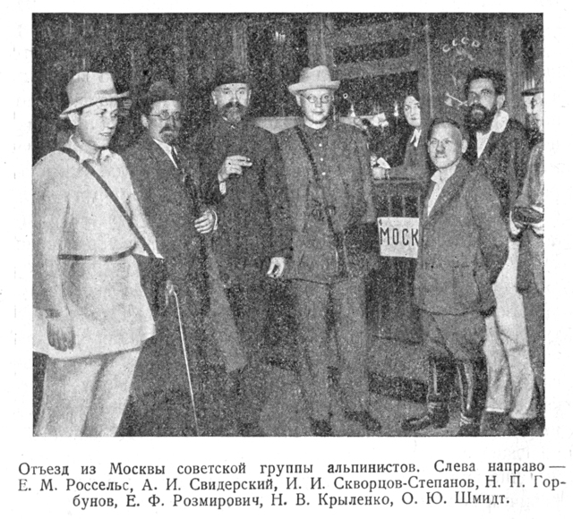 В первом ряду слева направо: астроном экспедиции Яков Беляев (расстрелян в 1930-м), геолог и географ академик Дмитрий Щербаков, Елена Розмирович (супруга Крыленко, тоже мастер альпинизма), опустил голову – «батька» Горбунов (расстрелян, как и Крыленко, в 1938-м), далее Ефим Россельс… Во втором ряду третий слева Крыленко, Отто Шмидт, третий справа – кинодокументалист Владимир Шнейдеров.