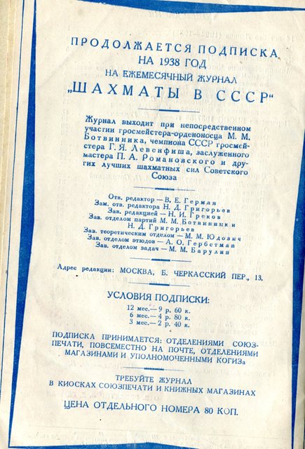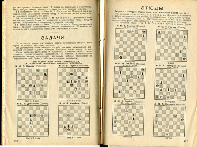 В 8-м номере за 1938 год «Шахматы в СССР» начали публиковать «Результаты Всесоюзного конкурса этюдов Клуба шахматно-шашечного мастерства ВЦСПС»