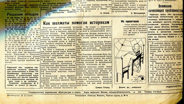 Если Александров и Ротинян, как это отражено в постановлении, опубликовали свои «оригинальные задачи» в апрельском номере немецкого журнала (за 1937 год), то член Центральной комиссии Р.Кофман – в июне, то есть уже после обмена ударами «64» и «Шахмат в СССР» по «важному вопросу».