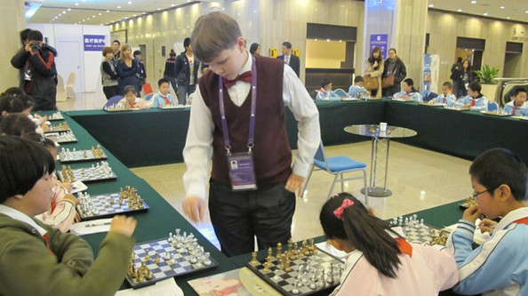 В конце 2011 года успехи в «интернетовских битвах» дали право поучаствовать во Всемирных интеллектуальных играх в Китае. Точнее даже не поучаствовать, а быть почетным гостем этого форума. Что может быть важнее, чем общение с элитными гроссмейстерами, игравшими рядышком в быстрые шахматы? Иванчук, Пономарев, Карякин, Грищук, Гашимов, Мамедьяров, Камский… А кроме того, Влад провел сеанс одновременной игры, в котором ему противостояли юные китайские шахматисты.