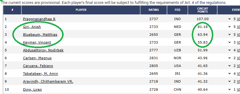 Если Прагг пройдет в ТП из Кубка мира (не очень вероятно, но возможно; родная сестра так вообще два Кубка подряд выиграла нет - две Большие Швейцарки подряд), то место в ТП в качестве 2025 FIDE Circuit winner вполне может занять не лучший шахматист года, не второй лучший, и не третий, а "четвертый лучший шахматист года". |