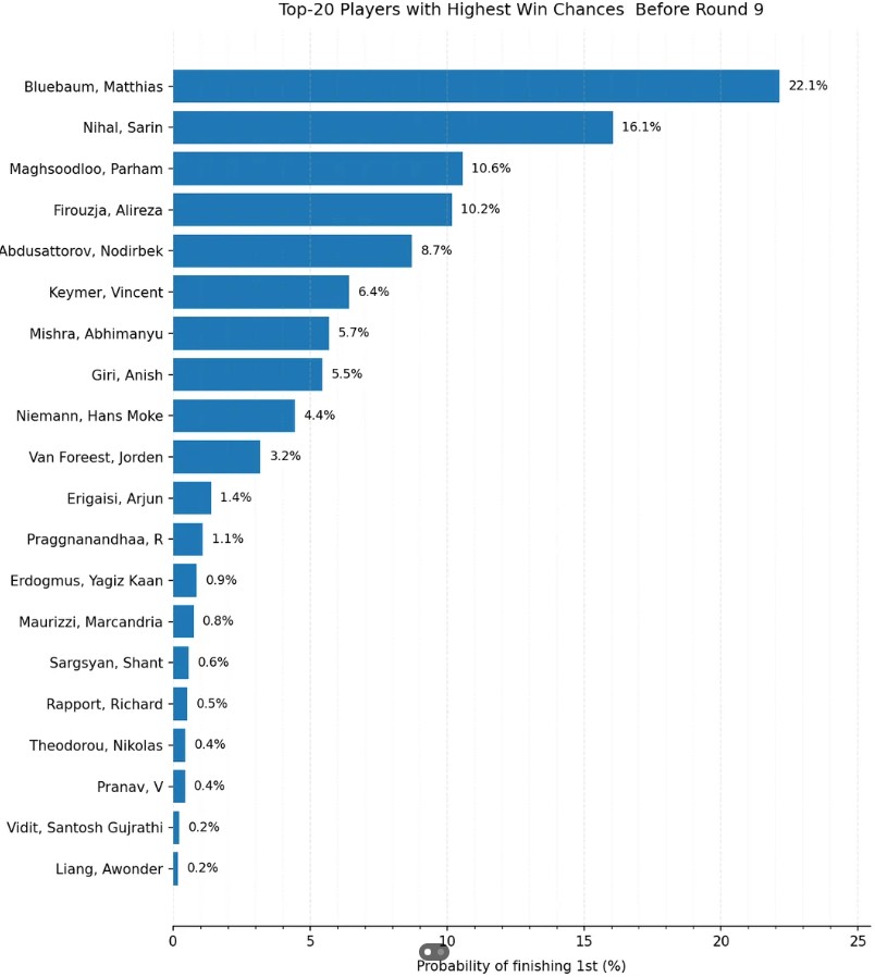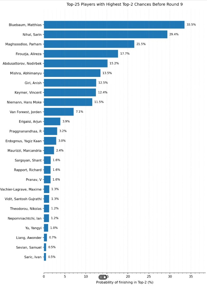 Monte Carlo Simulation of the 2025 FIDE Grand Swiss Before Round 9
