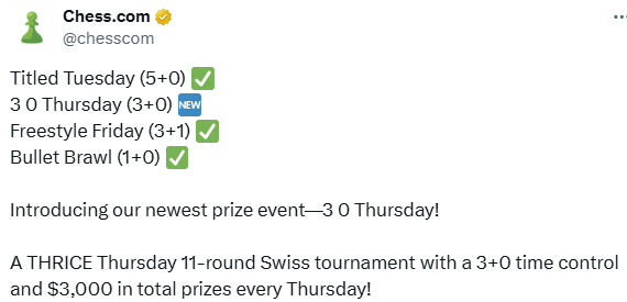 Новый контроль времени 5+0: заменяет 3+1: поскольку Кубок мира по киберспорту этим летом будет проводиться без дополнительного времени (с контролем 10+0), а Titled Tuesday теперь является частью одного цикла, это изменение унифицирует формат обоих событий, сохраняя при этом фундаментальный характер Titled Tuesday как блиц-турнира.