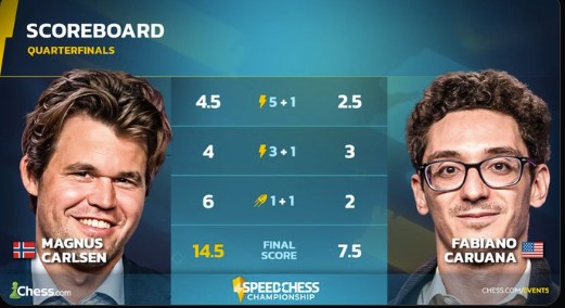 Магнус Карлсен против Фабиано Каруаны в четвертьфинале чемпионата по скоростным шахматам.