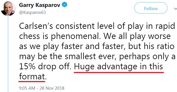 По поводу коротких контролей. Это просто другие шахматы. Они не хуже и не лучше - они просто другие. И замечательно, что наш замечательный чемпион мира, который не может доказать своего превосходства над сверстниками в матчах на длинных контролях имеет возможность доказать свое превосходство в иных, легких жанрах. Это действительно впечатляет и готов искренне его поздравить вместе с Вами с его замечательными победами в другие шахматы: в рапид и блиц.