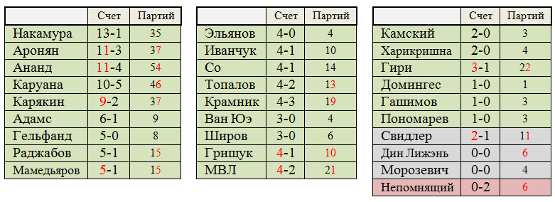 Рассмотрев таблицу, я, например, буду ждать с нетерпением новых партий Яна с Магнусом. Психологический аспект этих партий будет для меня наиболее интересным: сами-то игроки прекрасно помнят свой счёт и безо всяких напоминательных таблиц. |