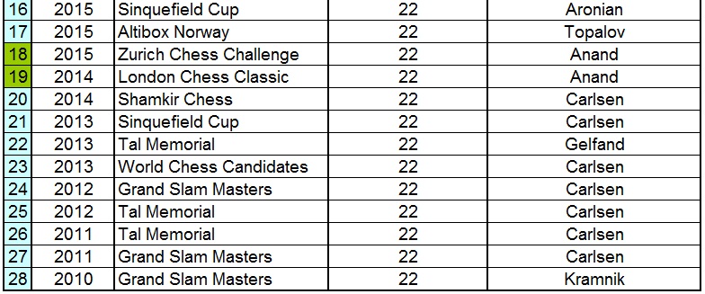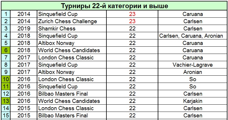 Понятно, что Карлсен больше не участвует в кандидатских турнирах. Но, благодаря его рейтингу, турниры с его участием имеют больше шансов оказаться в этой таблице.