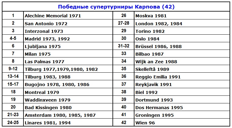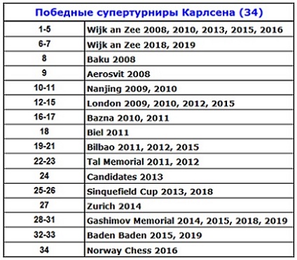 1. Совсем недавно я приводил данные об осязаемом приближении Карлсена в общей статистике побед в супертурнирах к его великим рекордсменам-предшественникам Каспарову и Карпову.