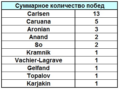 Примечательно, что доля турниров, выигранных Магнусом, уменьшается с годами. По этой таблице, за последние 3 года Каруана выглядит не хуже.