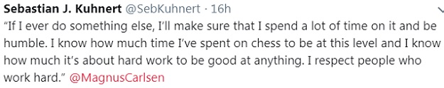 Ув. Jacob08, я увидел эту цитату из Магнуса на chess24.com сегодня и сразу скопировал её, чтобы поместить в Вашу тему здесь о нём. Но, Вы, конечно же, меня опередили; кто бы сомневался!... Но, цитата того стоит, кажется. Она многое говорит о Магнусе, как о человеке!...