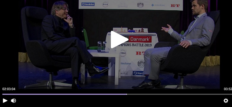 Ну, в данном то случае мне, как очевидцу событий, был бы грех не быть "на коне"). На фото Магнус делает ход в партии с моим приятелем Lennart L., который продержался дольше других в сеансе, в котором принимало участие три международных мастера. Lennart знаменит в Дании тем, что несколько лет назад он продал свою торговую империю шведам за три миллиарда DKR. Империю, созданную "с нуля" в возрасте 40+. Кроме того, он многолетний спонсор музыкальной группы моего сына.