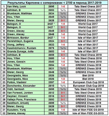 Я веду подробную статистику актуальной беспроигрышной серии Магнуса, и потому мне сравнительно несложно сделать выборку по группе из семи соперников на нынешнем массиве из 91 партий. Их легко отличить, поскольку средний рейтинг соперников в оставшейся "Лиге Карлсена", т.е. в 84 партиях составляет 2780.