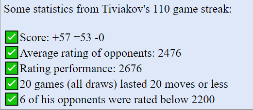 не 110, но 105 партий (т.е. за вычетом тех, что не обсчитаны ФИДЕ согласно правилам и, следовательно, не были рейтинговыми) - вполне нормальный рекорд Тивякова, на мой взгляд.