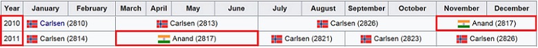 А вот формальную отметку 10-летия (=120 месяцев) владения №1 рейтинга (впервые 1/1-2010) Карлсен пересечёт лишь спустя полгода - с учётом тех 6 месяцев, которые Ананд суммарно "упорствовал") в начале Эры.