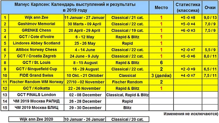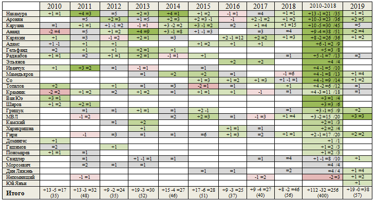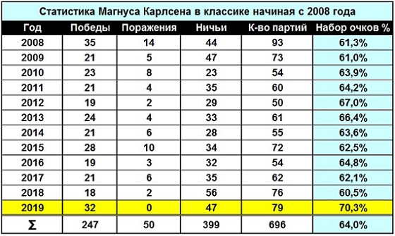 Завтра Магнус сыграет последнюю классическую партию в году и можно будет подвести итоги - его результаты против всей элиты за 2019 год.