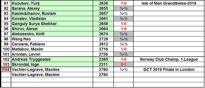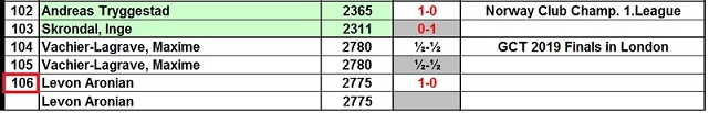 Значительная причина невообразимого) среднего рейтинга (2780) у 89 оппонентов с >2700 кроется, разумеется, в матчевом единоборстве с Фаби, у которого тогда было 2832 ЭЛО. В общей сложности за период серии №1 и №2 встречались 18 раз - все вничью.