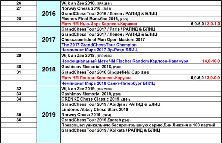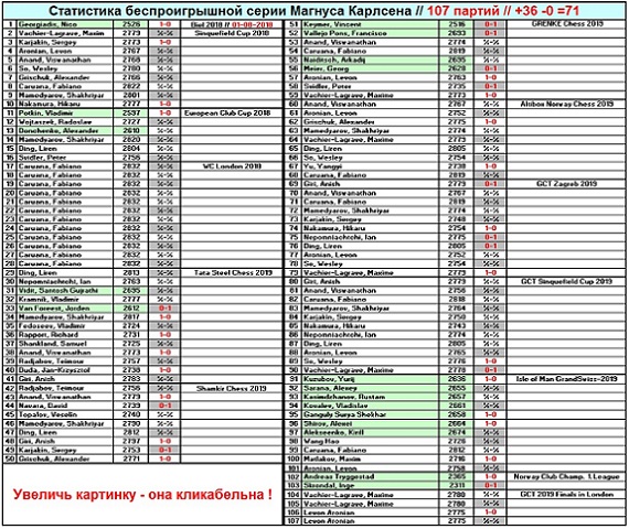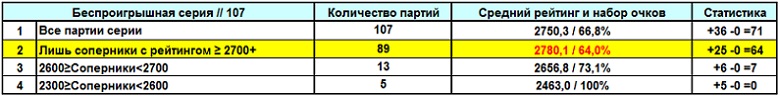 2) Как мне кажется, вторая строчка в следующей таблице - это нечто. 89 беспроигрышных партий с соперниками, чей средний рейтинг 2780 ЭЛО.