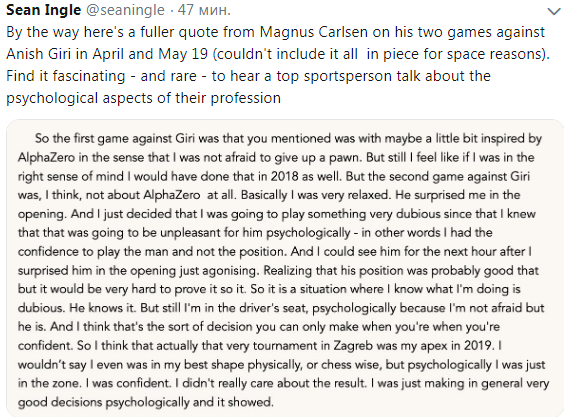 | И еще: Карлсену легко решиться на риск и ухудшение позиции против любого белкового шахматиста по понятным причинам, а другим оно надо? |