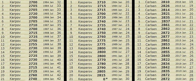 Рекорд Каспарова как самого юного владельца №1 рейтинга в 20 лет 263 дней был побит Карлсеном в возрасте 19 лет 32 дня, т.е. с отрывом почти в 1 год и 9 месяцев.