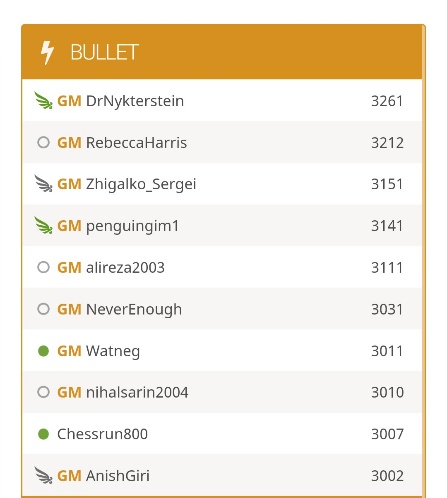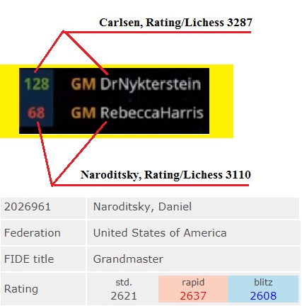 Снова пуля. Ещё одна ярчайшая звезда скоростной игры и теперь это был ГМ Дэниэл Народицкий (RebeccaHarris) в принципиальном матче с чемпионом мира. Очень крутой боец со своим стилем, с которым у Магнуса всегда идут принципиальные и ожесточенные бои. В Lichess Titled Arenas Народицкий местами весьма успешно играл против Магнуса, но по моему мнению, эти победы отнимали у него столько энергии, что в целом это плохо влияло на его окончательные результаты в этих турнирах.