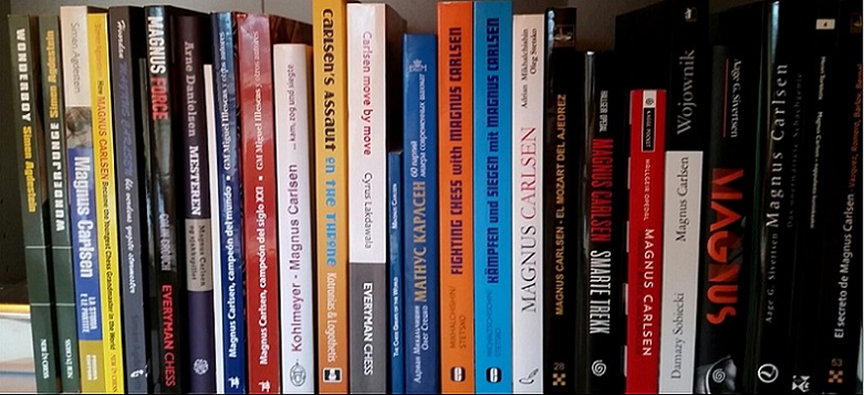 1. Постоянно пополняющаяся обширная библиография в отношении Карлсена благополучно существует на множестве языках и давно. Русский пока, к сожалению, просто недостаточно представлен. Обширная библиография, если я правильно понимаю - это и есть то, что Вы называете "главный вход", и он, смею заверить, исключительно "парадный". На снимке далеко неполно представлены те книги, которые изданы о Магнусе - даже у меня их больше, а в целом по шахматам у меня около 700 наименований.