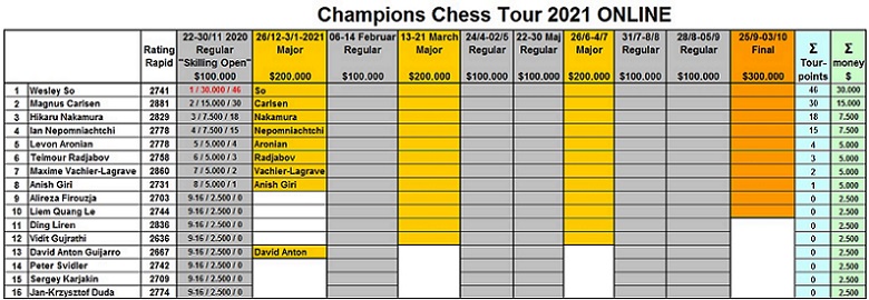 Объявлено имя девятого счастливчика, который, наряду с восемью участниками стадии нокаут в "Skilling Open", будет приглашен в MAJOR серии, начинающийся 26 декабря. По положению платные пользователи сайта chess24.com имели опцию выбора, и большинство проголосовало за испанца David Anton Guijarro. Владельцы трёх оставшихся вакансий будут сообщены позднее. Победитель турнира MAJOR получает непосредственный доступ к финалу серии Champions Chess Tour в сентябре 2021 года.