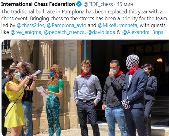 Выше уже упоминалось, что на пути в Сочи Магнус побывал в Испании, где в Памплоне ему и его отцу был организован потрясающий приём, задуманный как достопримечательность в городе, известном своими ныне отменёнными забегами с быками. В этом году праздник Сан-Фермин отмечался шахматным онлайн фестивалем, и норвежец играл из исторического номера, где обычно останавливался Эрнест Хемингуэй. Победив в матчах из восьми партий Эдуардо Итуррисага, Уэсли Со и Левона Ароняна, Карлсен завоевал главный приз в €20 000.