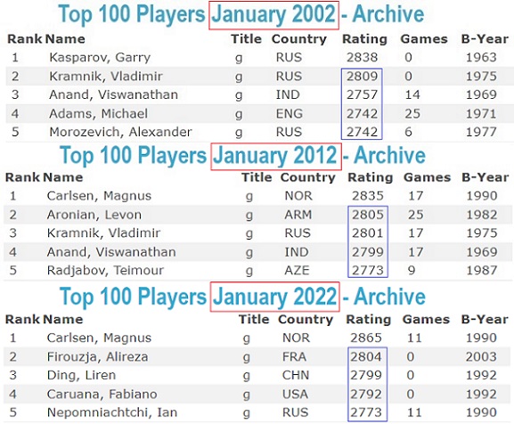 Крамник прав в отношении Карлсена и оценки его ставки на 2900 - нынешнему чемпиону для мотивации необходима конкретная цель. В своих раздумьях Магнус, возможно, представил себе картинку динамики развития рейтинга Топ5 за последние 20 лет, где величины с №2 по №5, по существу, оставались без изменений. Среди прочих аргументов, он мог себе представить, что "на старости лет" пожалеет, что не предпринял серьёзной попытки прорыва к 2900, пока он в силе, и теоретически может этого достичь.