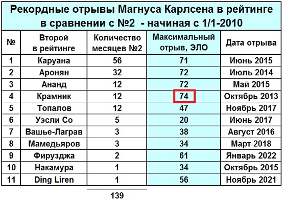 11 шахматистов находились на позиции №2 в списках ФИДЕ, возглавляемых Карлсеном. Наибольший отрыв от преследователя пока зарегистрирован в октябре 2013, когда отрыв от Крамника составлял 74 ЭЛО.