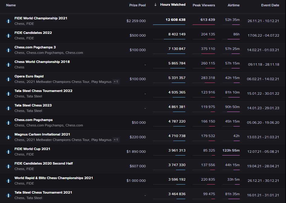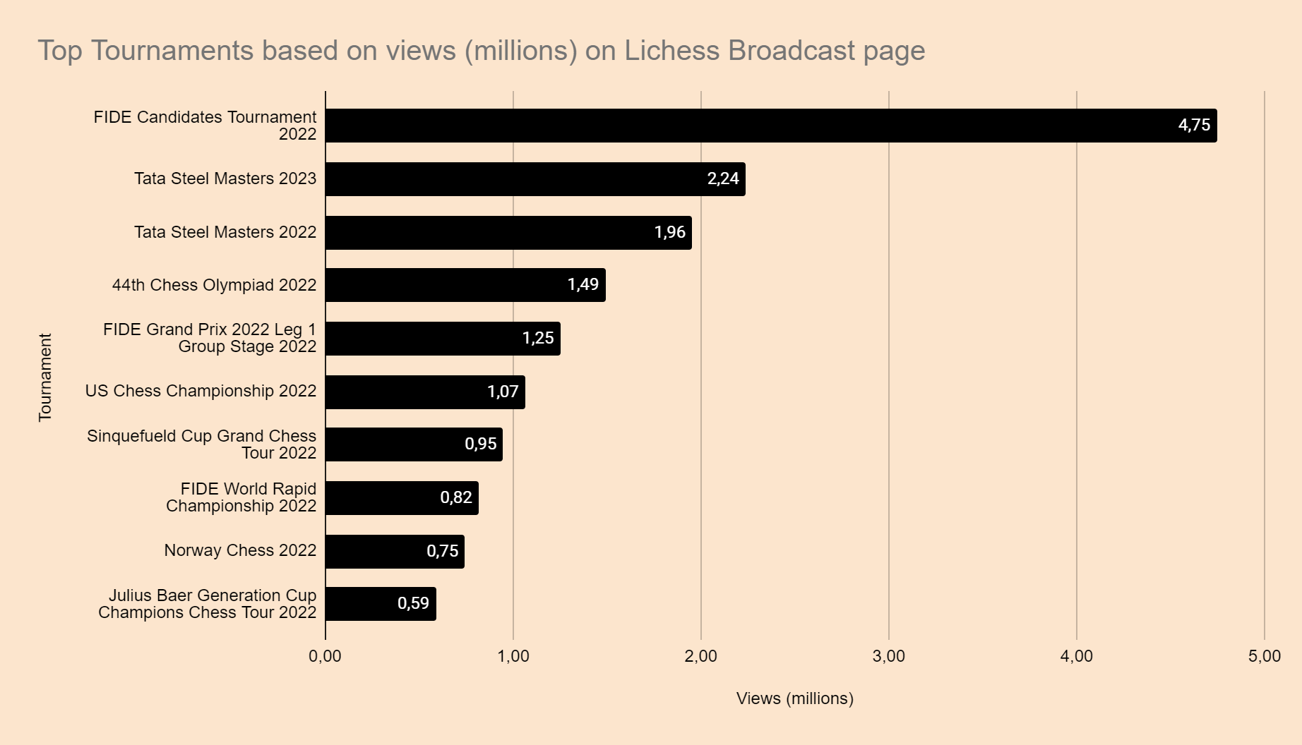 | Recently Lichess tweeted that on their broadcast site, where you can follow almost all top events, 8 out of the top 10 events the last year were classical tournaments.2 I asked them about the specific numbers, which they have delivered: |
