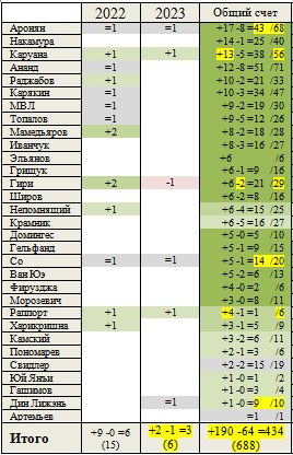 С Каруаной и Раппортом счет Карлсен ещё более увеличил, с Ароняном, Со и Дином сохранил статус-кво, ну а с победителем Вейка Гири - "подпортил".
