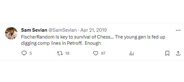 Условный Дубов, например, вообще не так давно говорил, что новые идеи какие-то в обычных шахматах тяжело искать, зато в ШФ-то их очень много, и там есть где развернуться любителю подготовки.