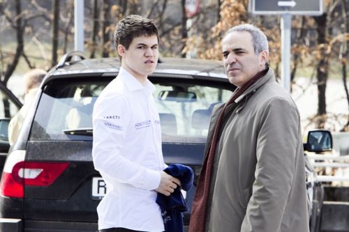 Magnus Carlsen and Garry Kasparov in April 2010, photographed by Heiko Junge. The average Elo rating of this formidable two-man team at their peak: 2866.