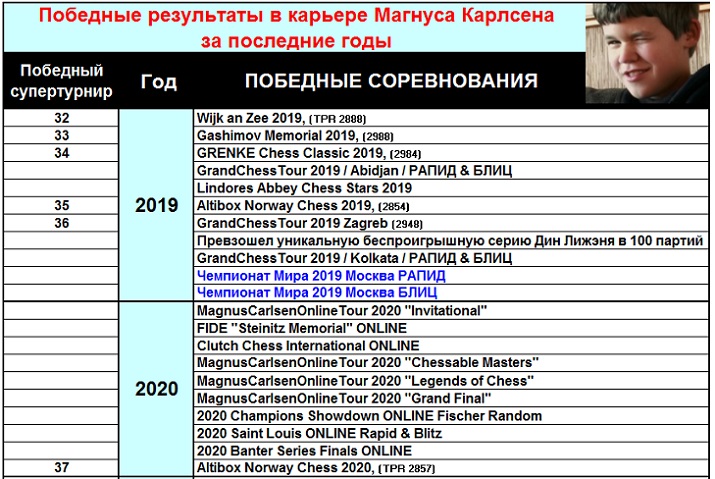 После этого на счету Карлсена ещё 13 турнирных побед за доской (не считая побед в онлайн-турнирах). Вот они