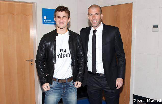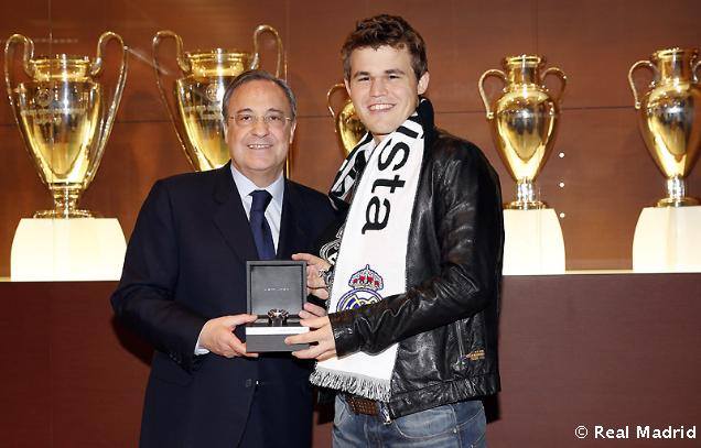 Магнус Карлсен прилетел накануне в Мадрид по персональному приглашению президента футбольного клуба "Реал" Флорентино Переса. В футболке клуба, за который болеет, с номером "1" на спине, Карлсен вышел на поле стадиона "Сантьяго Бернабеу" за минуту до начала матча испанского чемпионата "Реал" - "Вальядолид" и под аплодисменты трибун нанес первый удар по мячу.