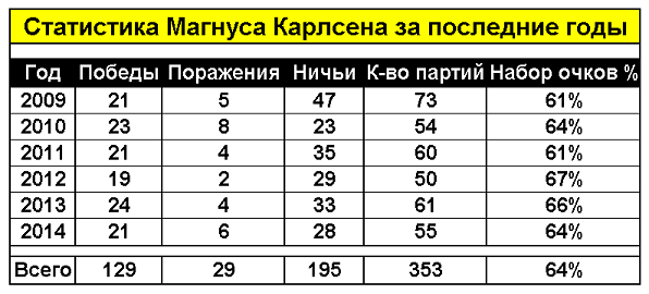 Рассмотрим более подробно достижения Магнуса в прошлом году с помощью полной выборки результатов всех 55 партий за 2014 - благо она у меня есть).