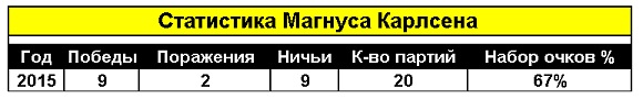 Результаты в этой таблице проставлены без учёта "белые/черные", т.е. 1-0 => победа Карлсена, 0-1 => поражение Карлсена