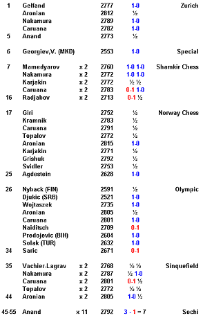 Средний рейтинг соперников в 55 партиях составлял 2756,2. Если из любопытства учесть лишь 50 партий, поскольку уважаемые Georgiev (2553),Nyback (2591),Djukic (2521),Predojevic (2604) и Solak (2632) обычно играют "в другой песочнице") - то ответ будет 2773,8.