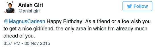 Узнав из твита Гири на ЧессПро, что у Магнуса нет девушки, она тут же организовала тренеровочный сбор на предмет знакомства в Лондоне. :-)