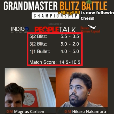 На Ютубе было, я где-то половину посмотрел. Магнус выиграл 14,5:10,5.