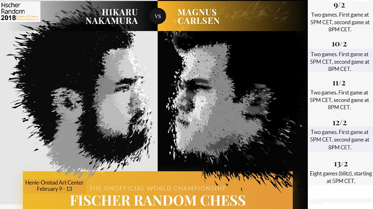 This “unofficial chess960 World Championship” will see World Champion Magnus Carlsen take on Hikaru Nakamura over 16 FischerRandom games – 8 at a one-hour per player time control over four days, and then 8 blitz games on the final day.