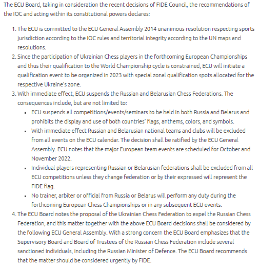 Европейский Шахматный Союз, среди прочих мер (например, приостановки членствa РШФ и БШФ) запретила участия российским и белорусским шахматистам, если только они не сменят федерацию или не будут играть под флагом ФИДЕ.