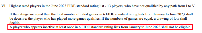 One hundred players shall qualify by their rating. For this purpose, the FIDE rating in June FIDE Standard Rating List shall be used. In case of equality, the total number of rated games in 12 standard rating periods from July 2022 to June 2023 shall be decisive: the player with the most number of games shall qualify. If these numbers are equal, the drawing of lots shall decide.