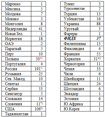 Жду изменений в базе данных ФИДЕ (изменений в профилях "утвержденных" 12-ти новых гроссмейстеров), после чего приведу обновленную версию таблицы. |