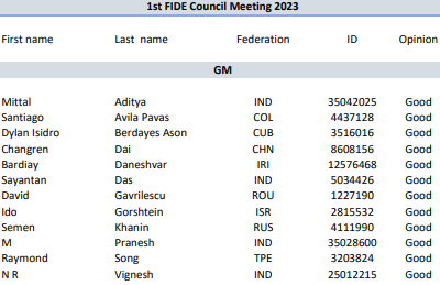 3) Утверждены в звании GM 12 из 15 соискателей (Индия пополнилась четырьмя новыми гроссмейстерами). Какие решения приняты в отношении Шубина (Россия), Нигматова (Узбекистан) и Laurent-Paoli (Франция) - не сообщается