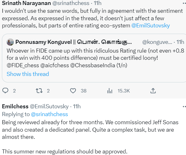 Конечно, правила дурацкие. Изначально по системе Эло максимально возможная разница при подсчёте рейтингов (МВР) принималась 350 пунктов (всегда). Потом стало 400, а теперь и до 400 можно уменьшать разницу только раз за турнир, отсюда безумные ожидаемые результаты 0,99, что не лезет ни в какие ворота. И все эти реформы проходили синхронно с постоянным уменьшением начального рейтинга (с изначального 2200 до, на сегодняшний момент, уже 1000). Тогда как самоочевидно, что такой процесс должен был, напротив, сопровождаться уменьшением, а не увеличением МВР (до 300, например). |