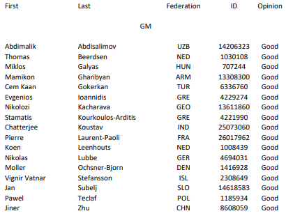 Это из сообщения на сайте ФИДЕ сразу после заседания Совета, состоявшегося 1 августа. После некоторой паузы последовал и список этих 17-ти, в котором против каждой фамилии стоит Opinion Квалификационной Комиссии - Good ("добро" по-нашему).