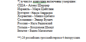 Но затем с двумя фамилиями обнаружилась какая-то неувязка, в результате которой исландец Стефанссон получил повышение в базе ФИДЕ только в самом конце августа, а несчастного француза Лоран-Паоли прокатили во второй раз (что-то с ним было не так и на предыдущем Совете). Причины - не в рейтинге и не в отсутствии в нормах швейцарок - с тем и другим у обоих порядок. А в чем - никому не известно. |